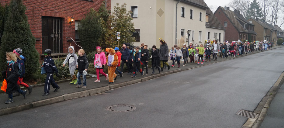 Um halb 10 traf sich die gesamte Schulgemeinde erneut, um zur Lohschule weiterzuziehen. Gemeinsam zogen wir von da aus durch die dattelner Innenstadt. Neben Musik, viel Lachen und „Helau-Rufen“ lag der Fokus der Kinder auf den „Kamellen“, die Eltern und Freunde der beiden Schulen am Wegesrand warfen.