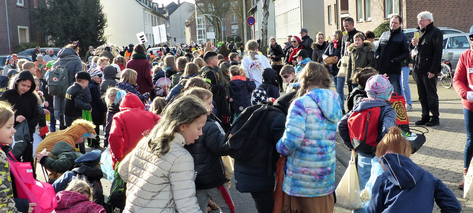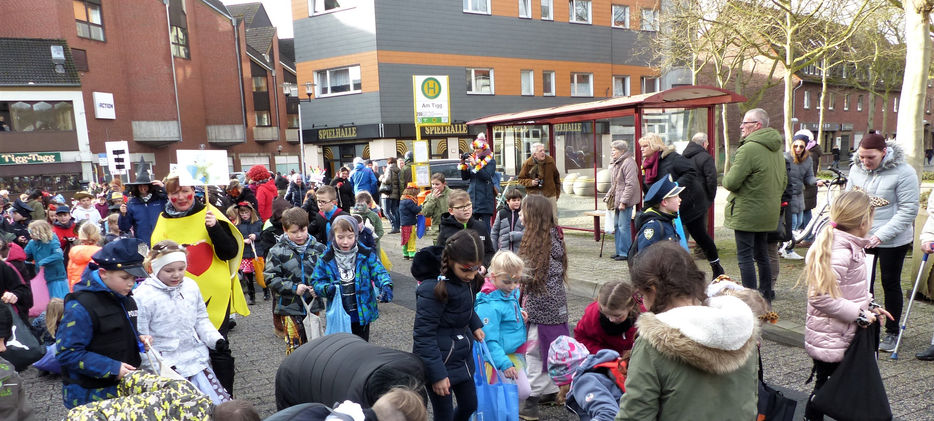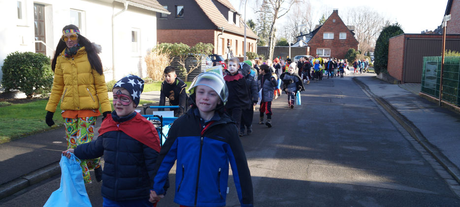 Um halb 10 traf sich die gesamte Schulgemeinde erneut, um zur Lohschule weiterzuziehen. Gemeinsam zogen wir von da aus durch die dattelner Innenstadt. Neben Musik, viel Lachen und „Helau-Rufen“ lag der Fokus der Kinder auf den „Kamellen“, die Eltern und Freunde der beiden Schulen am Wegesrand warfen.